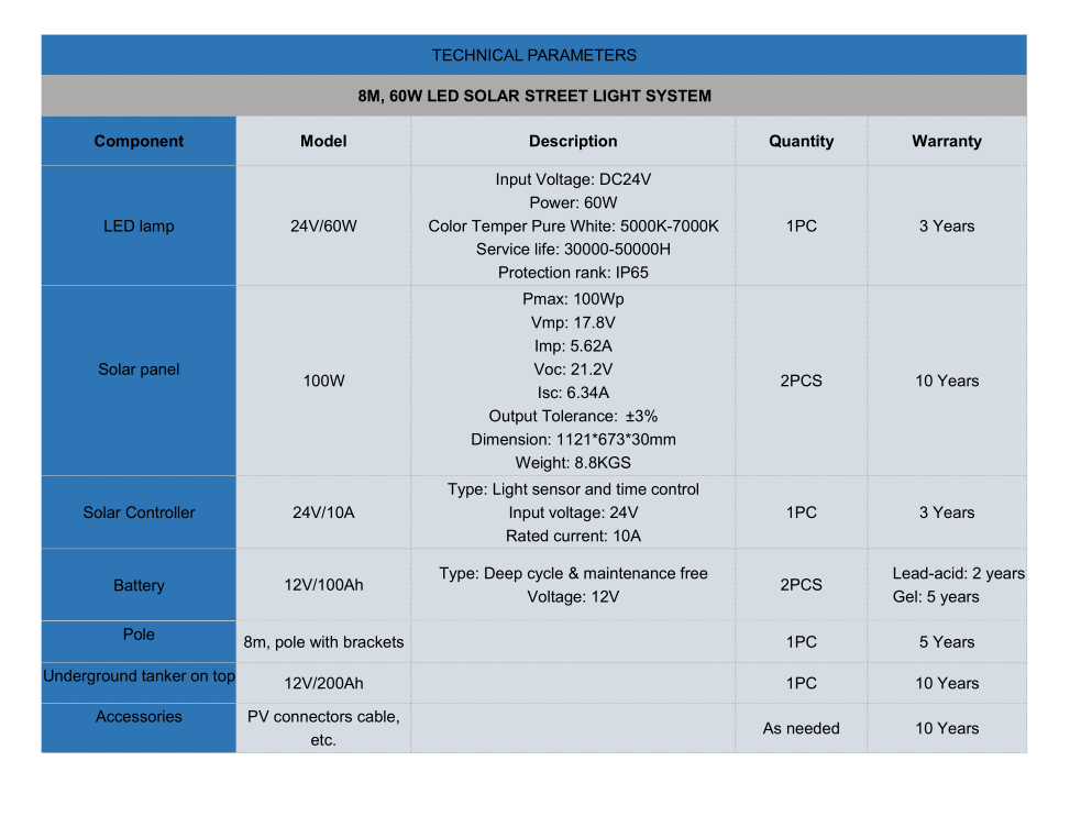8 એમ, 60 ડબલ્યુ એલઇડી સોલર સ્ટ્રીટ લાઇટ સિસ્ટમ